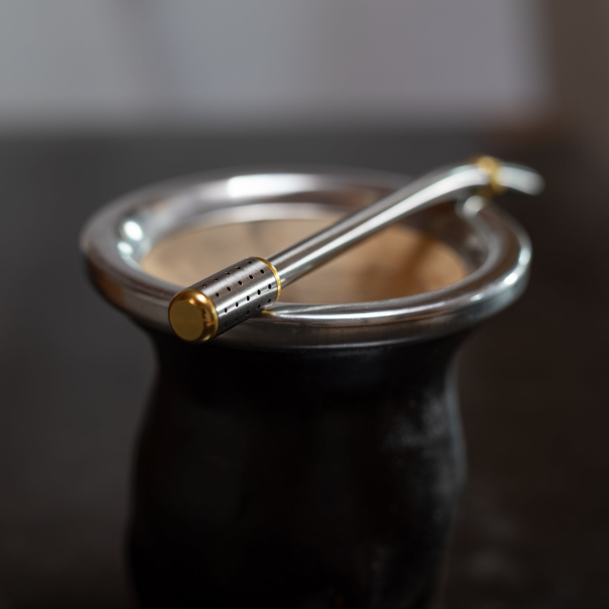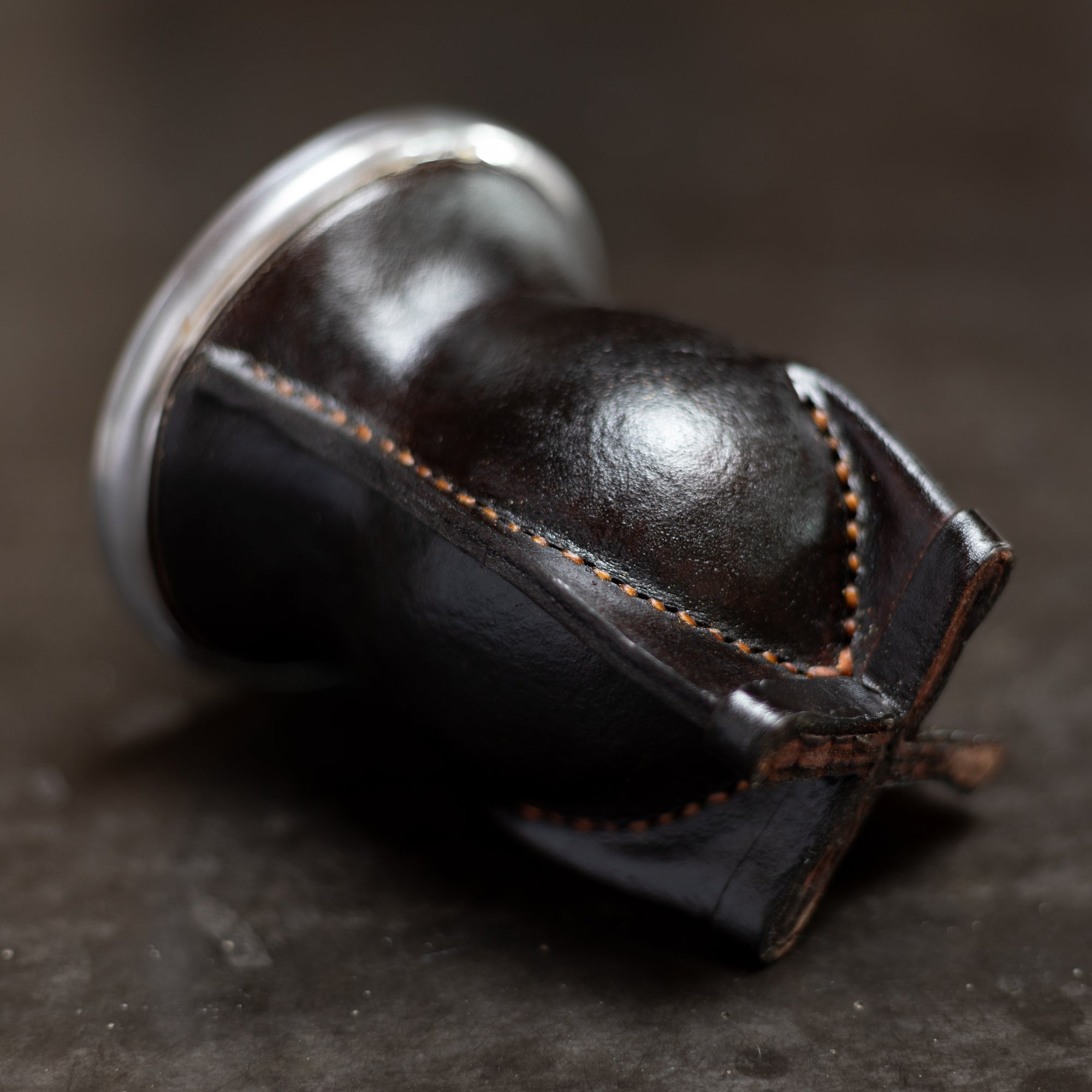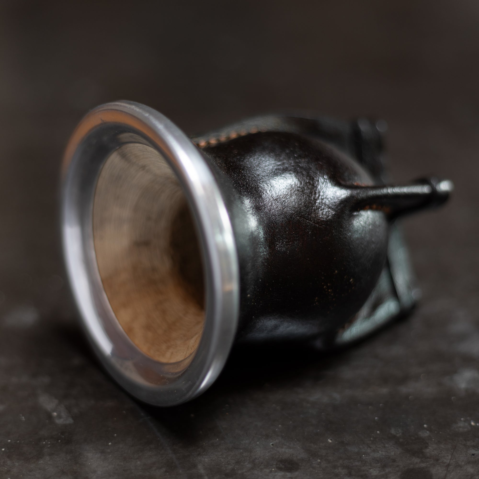 Edler Matebecher aus Kürbis, mit dunkelbraunem Leder überzogen und mit einer Ringverzierung aus Metall versehen.